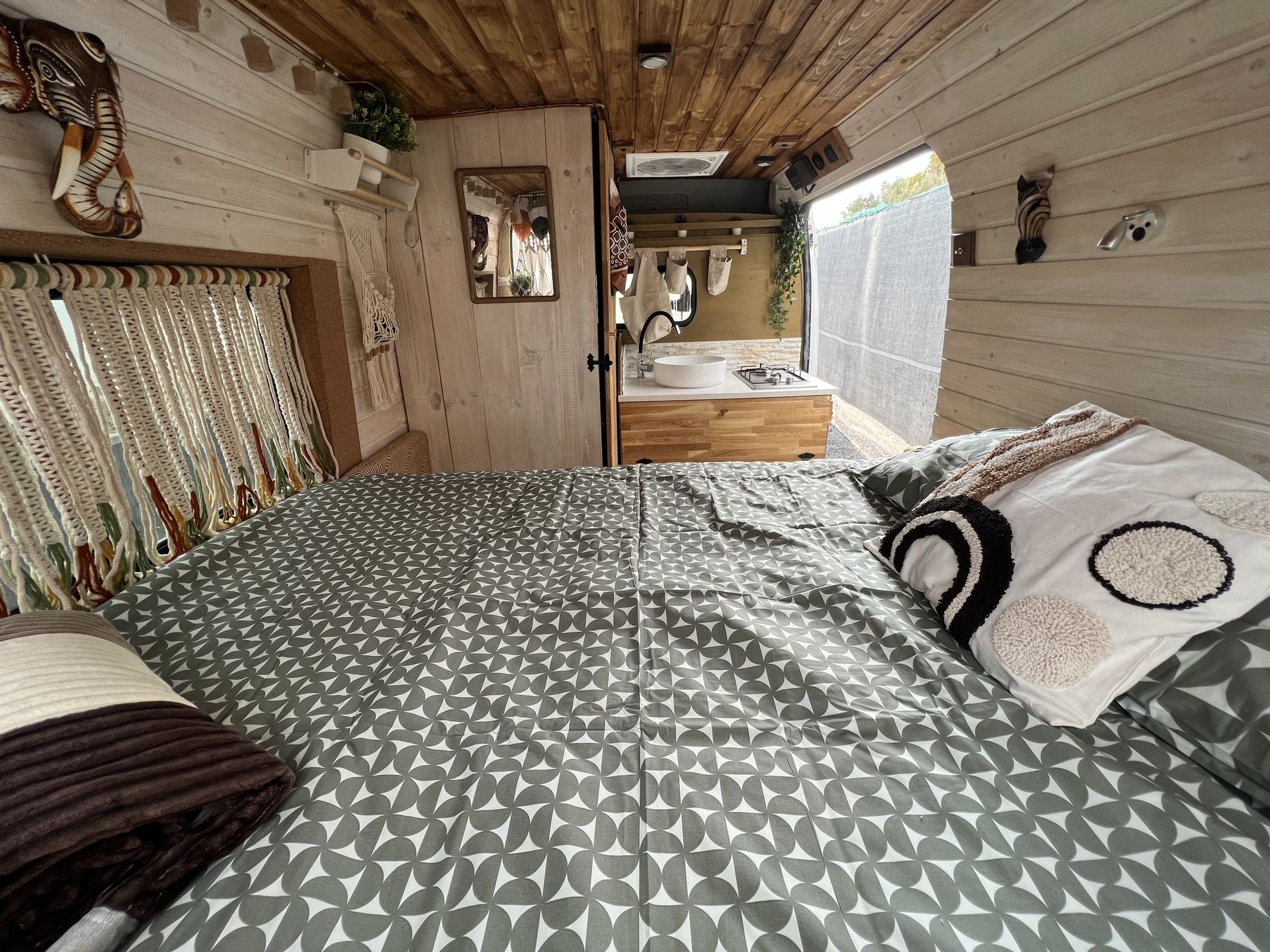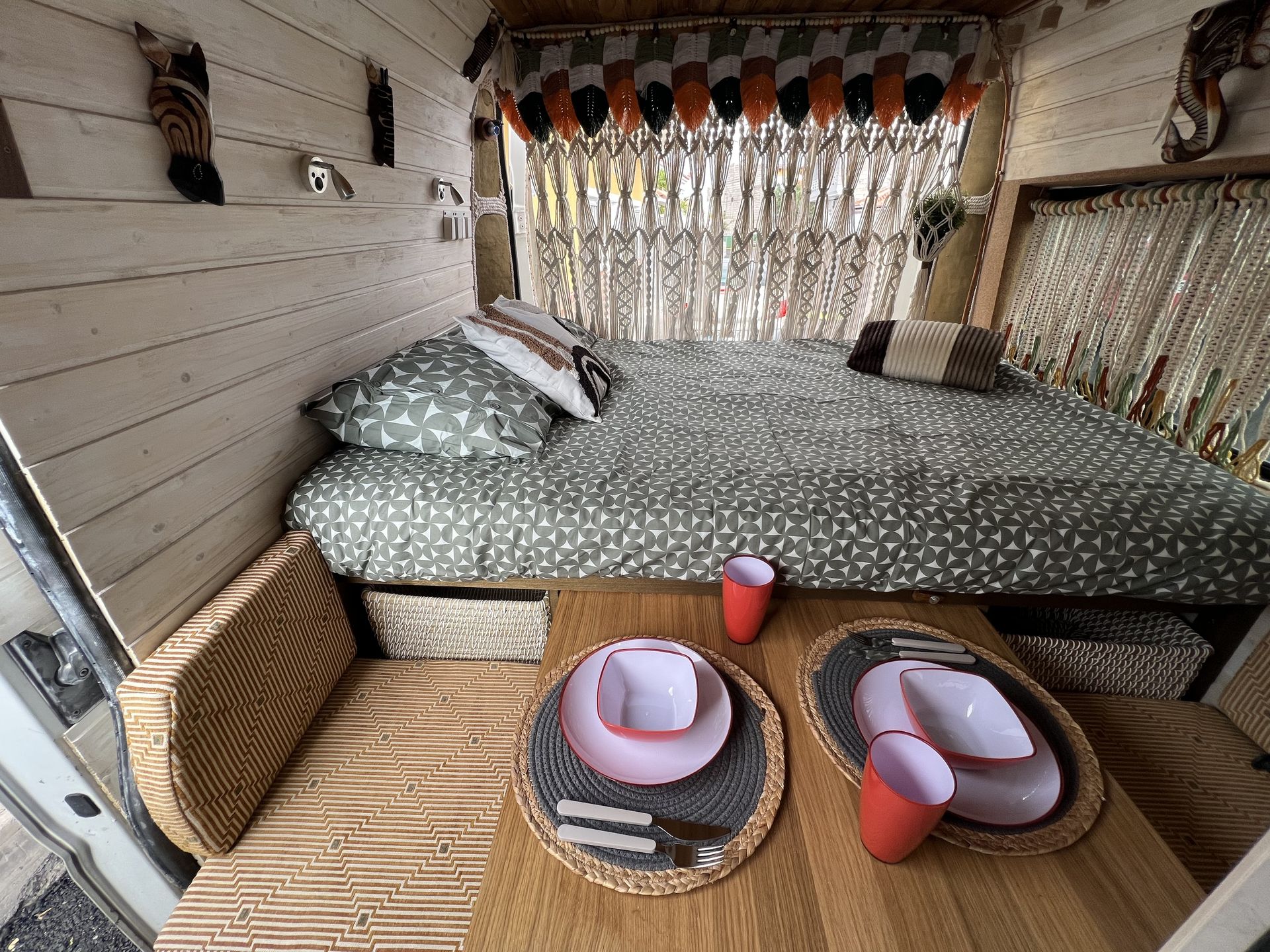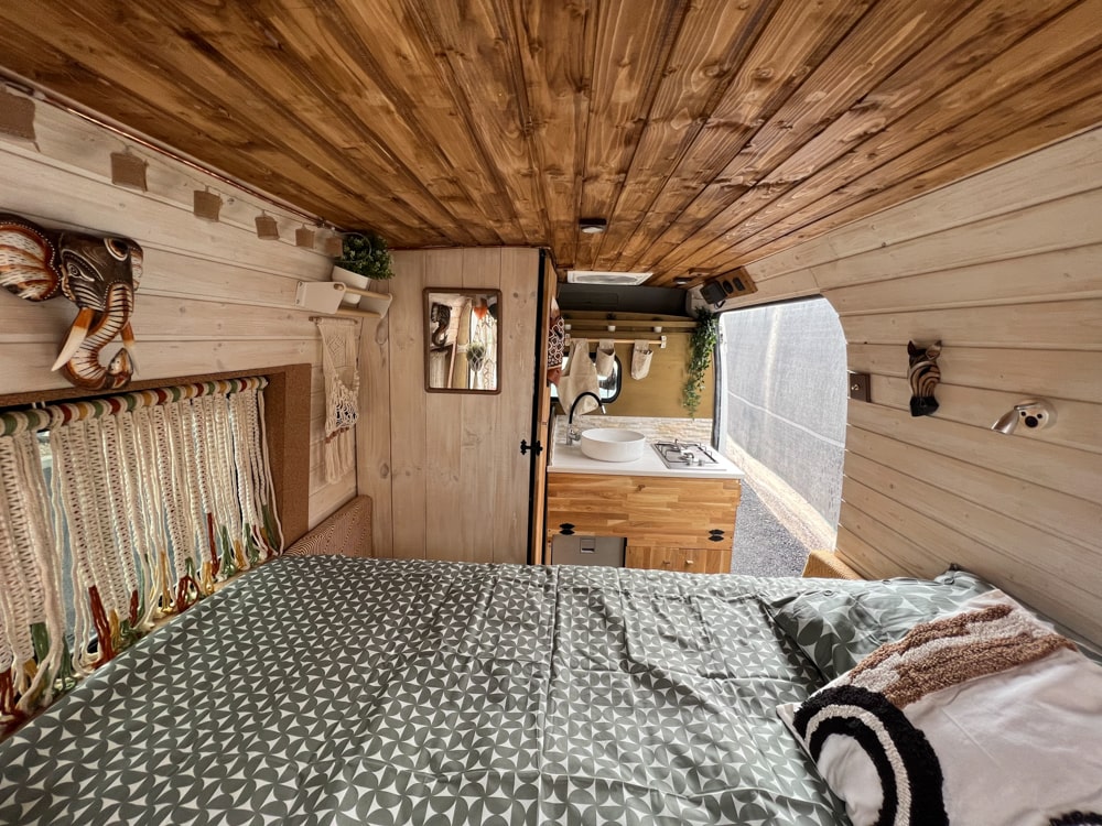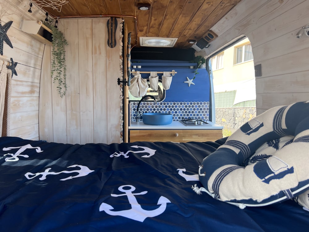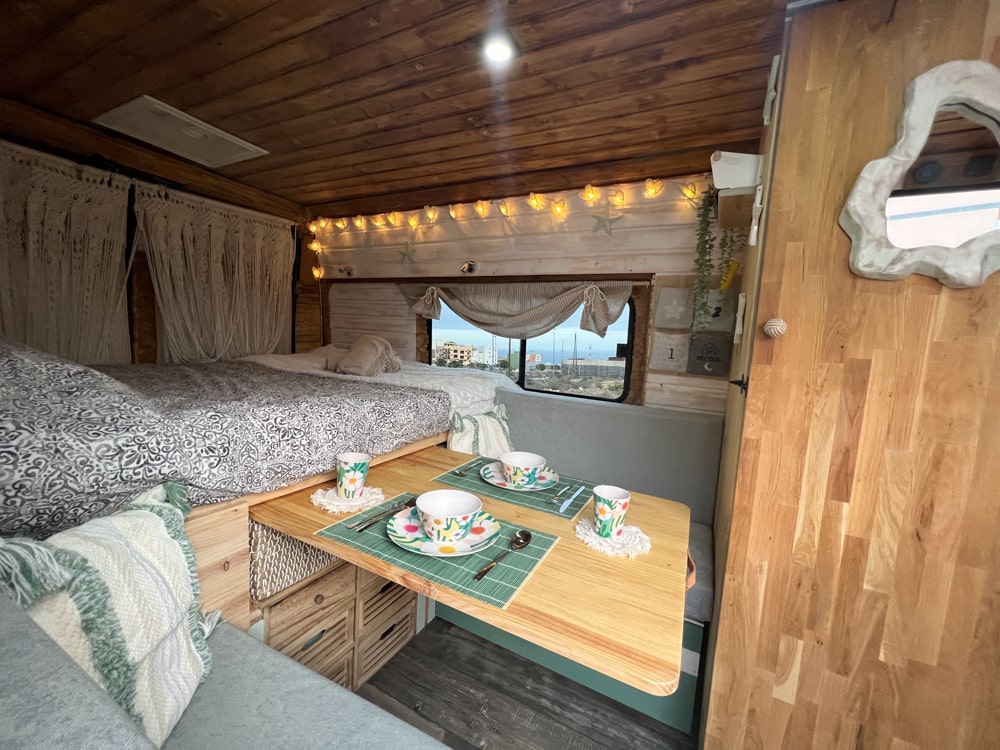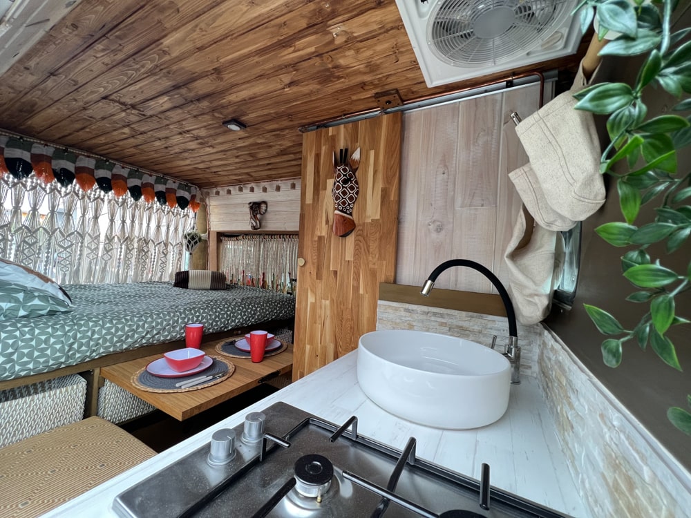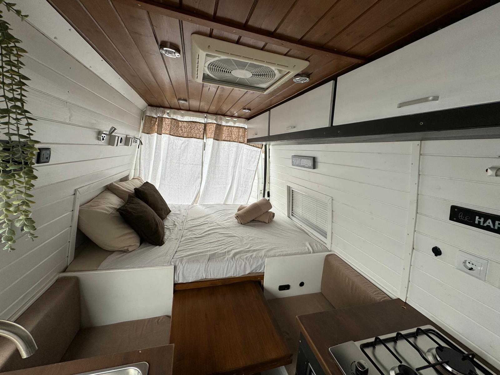 Esta camper hecha a mano es perfecta para explorar la isla con total libertad. Tiene cama doble, espacio extra para un niño, cocina equipada, ducha con agua caliente, panel solar y todo lo necesario para sentirte como en casa. Cómoda, práctica y con mucho encanto, es una forma única de descubrir los rincones más bonitos de la isla.