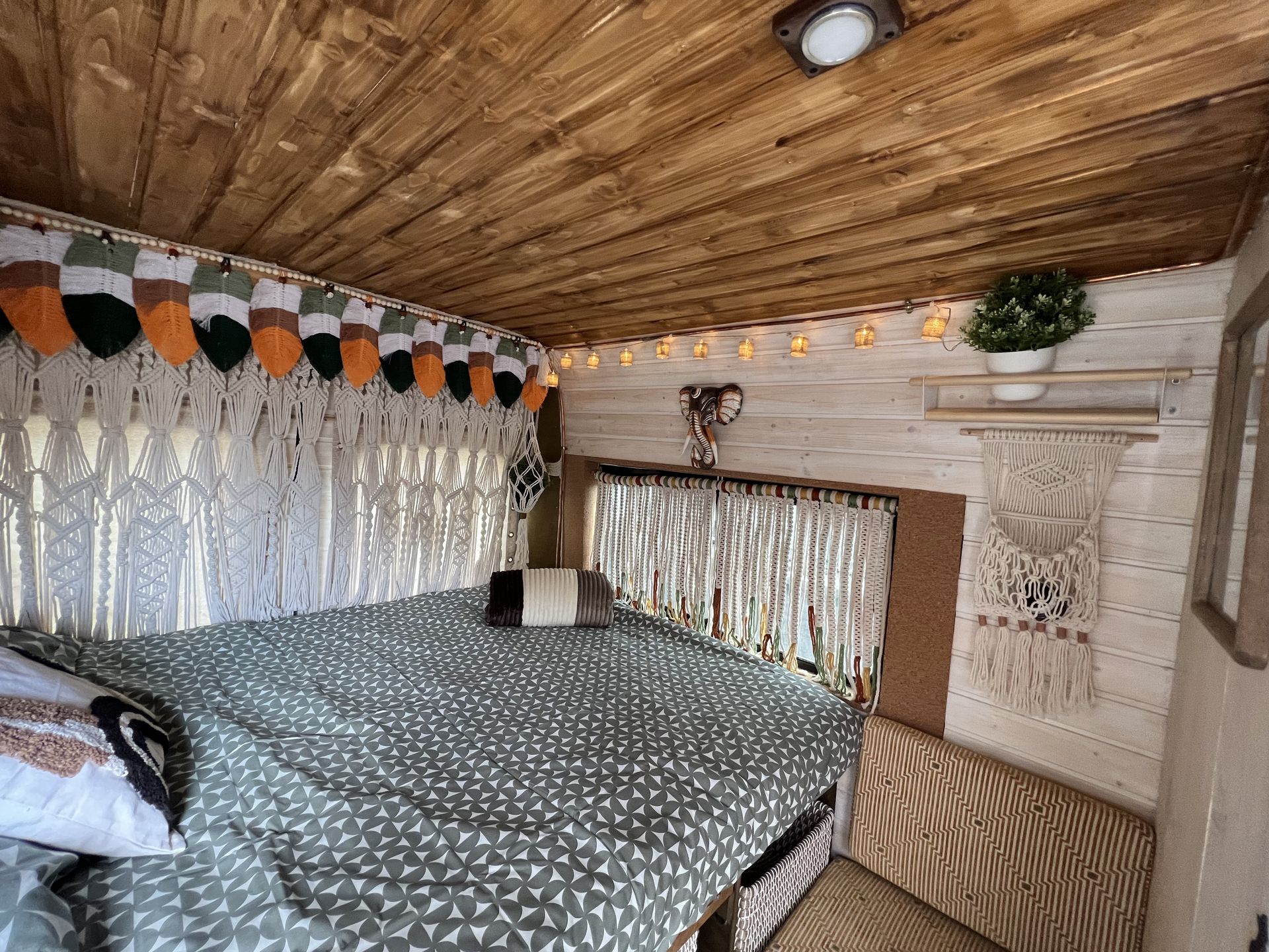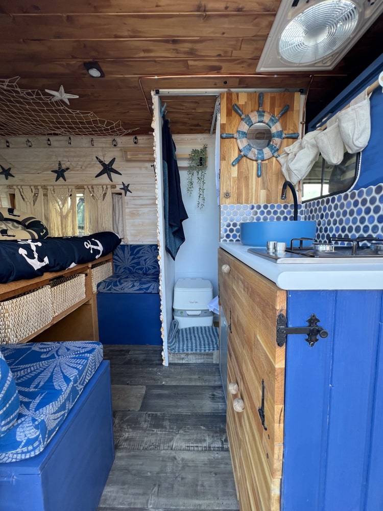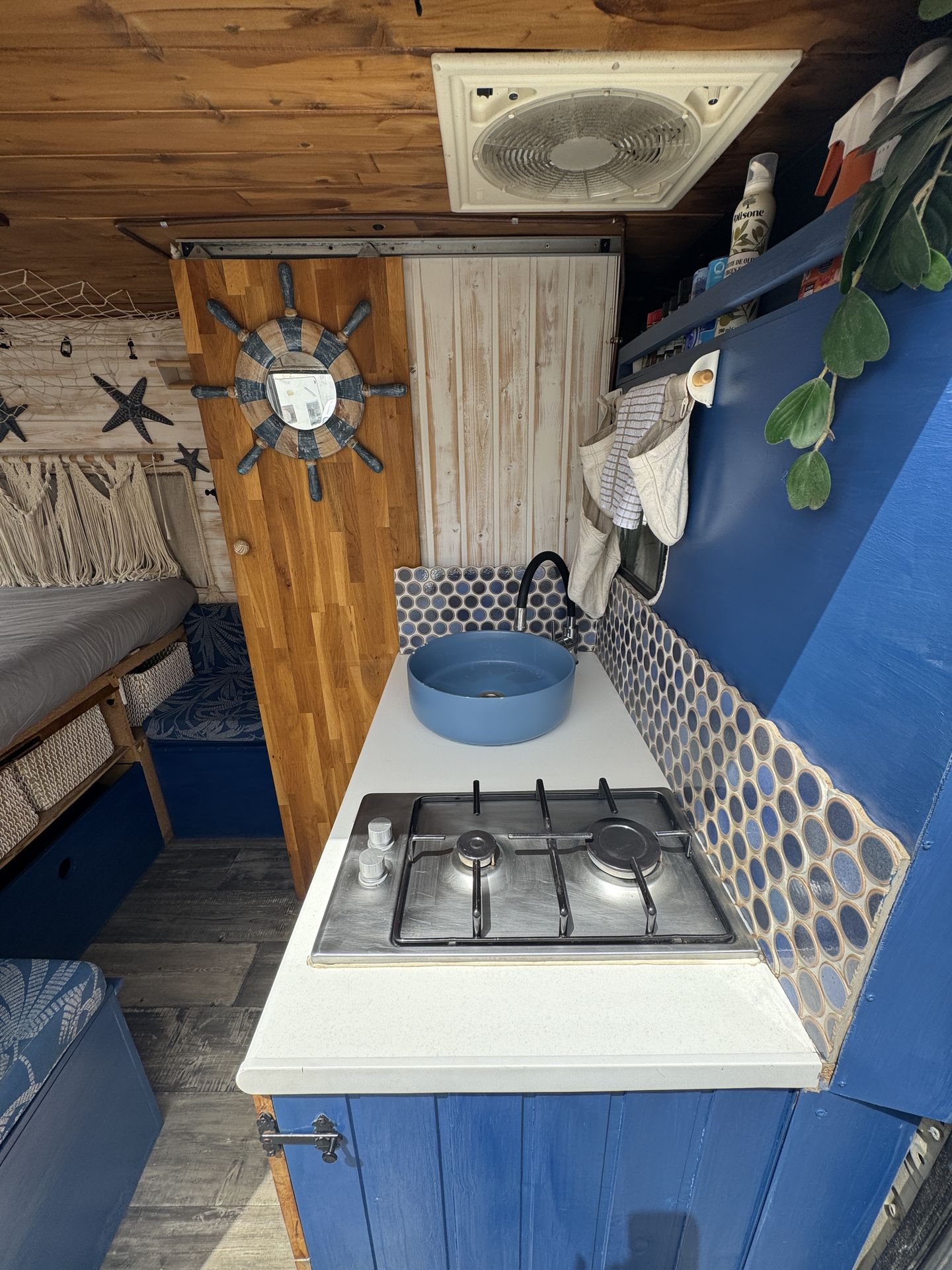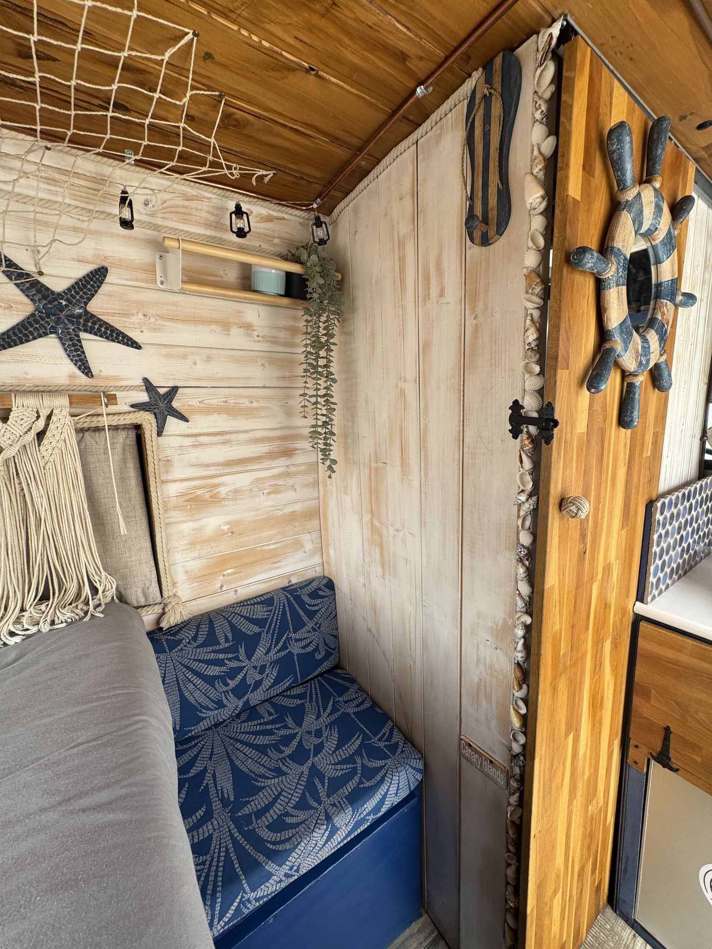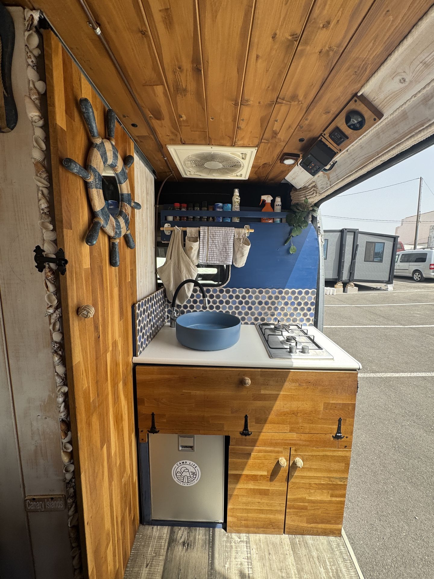 Esta camper hecha a mano es perfecta para explorar la isla con total libertad. Tiene cama doble, espacio extra para un niño, cocina equipada, ducha con agua caliente, panel solar y todo lo necesario para sentirte como en casa. Cómoda, práctica y con mucho encanto, es una forma única de descubrir los rincones más bonitos de la isla.