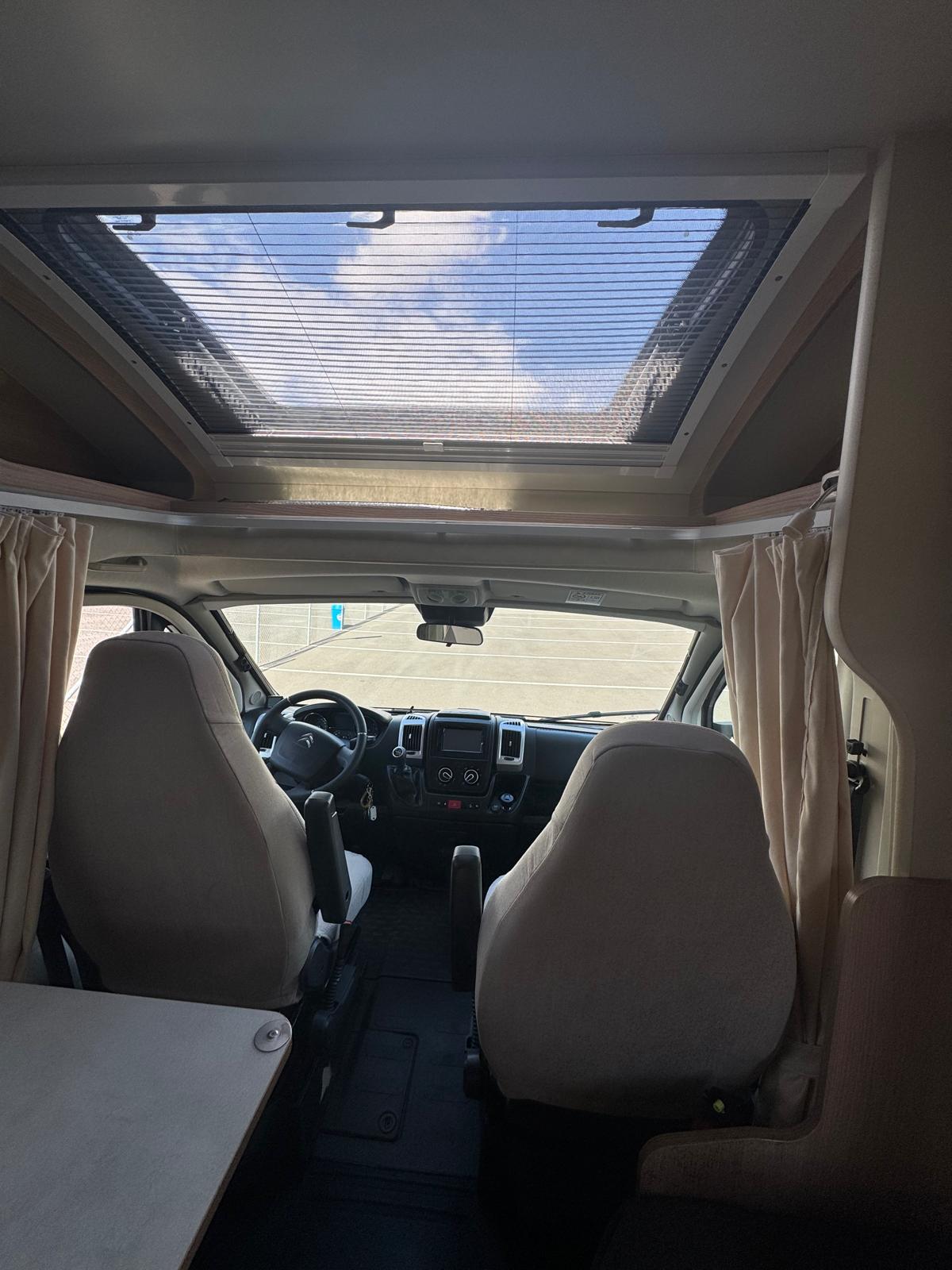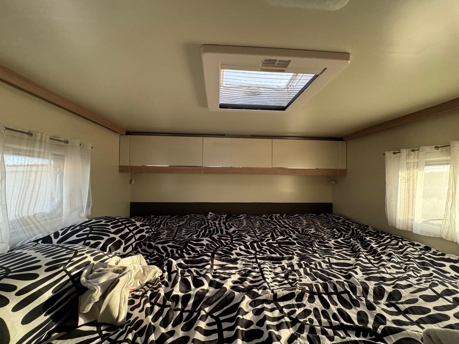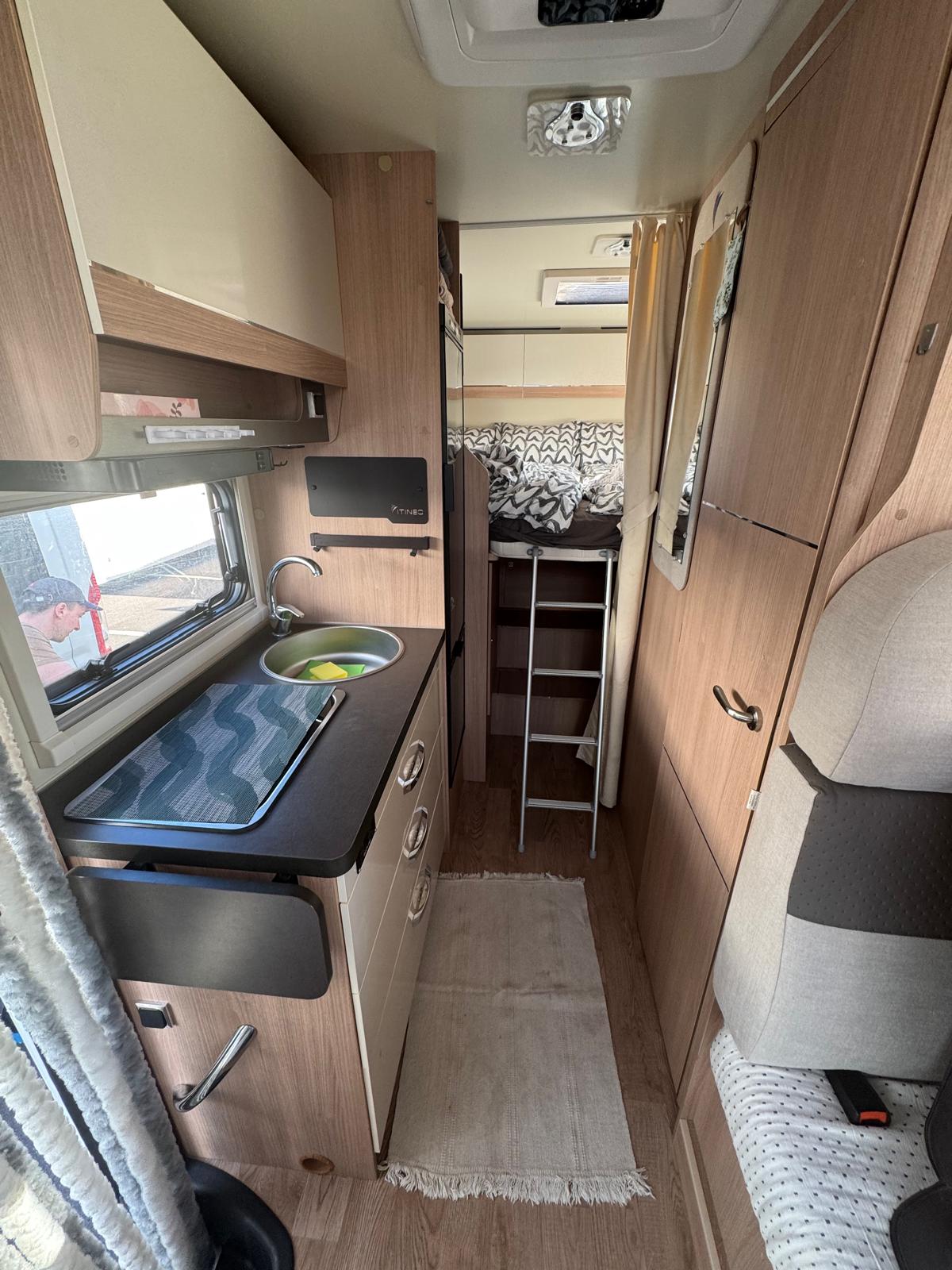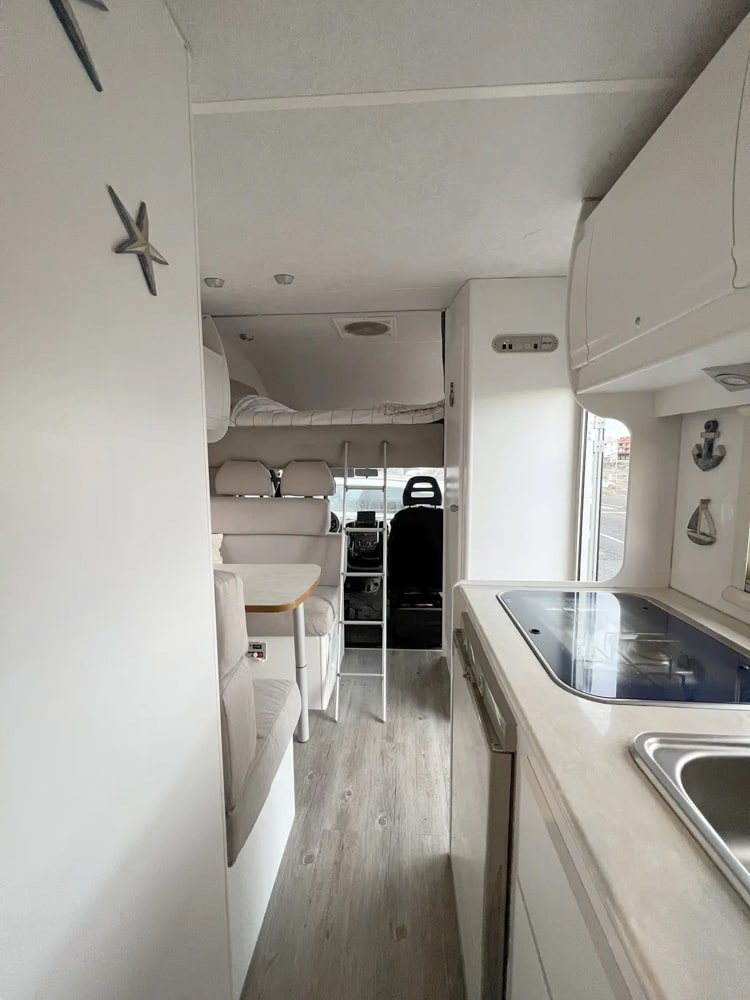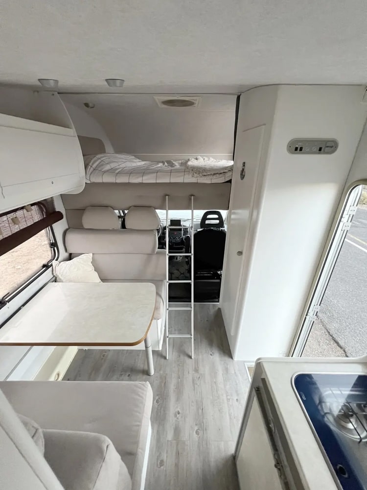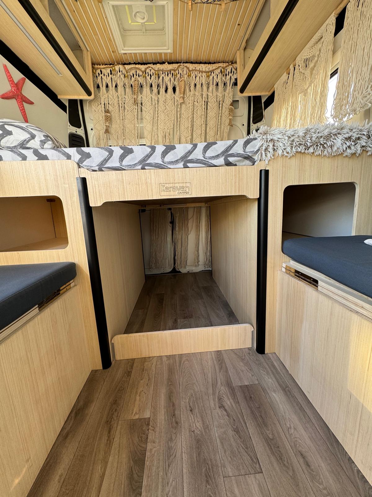 Esta camper es perfecta para familias, amigos o parejas que buscan comodidad y libertad en la carretera. Cuenta con dos camas en litera, una de ellas replegable en el techo, lo que la convierte en una opción muy práctica si solo viajan dos personas, dejando más espacio y comodidad durante el día.