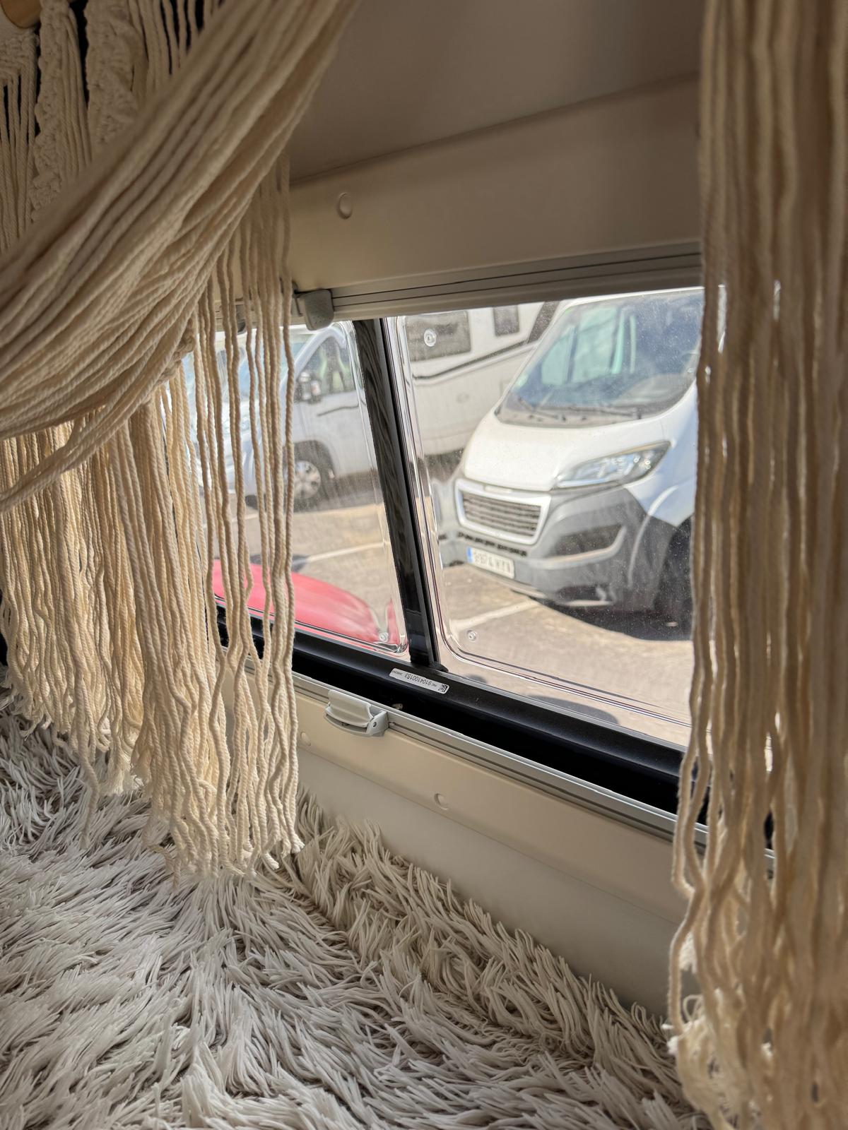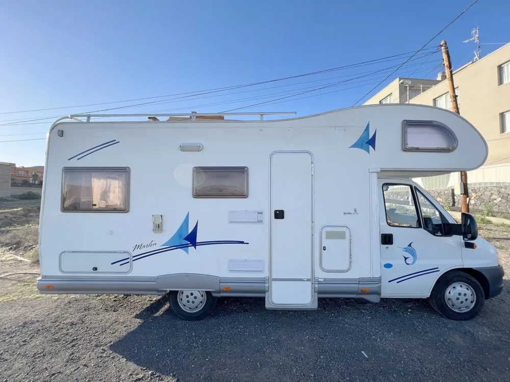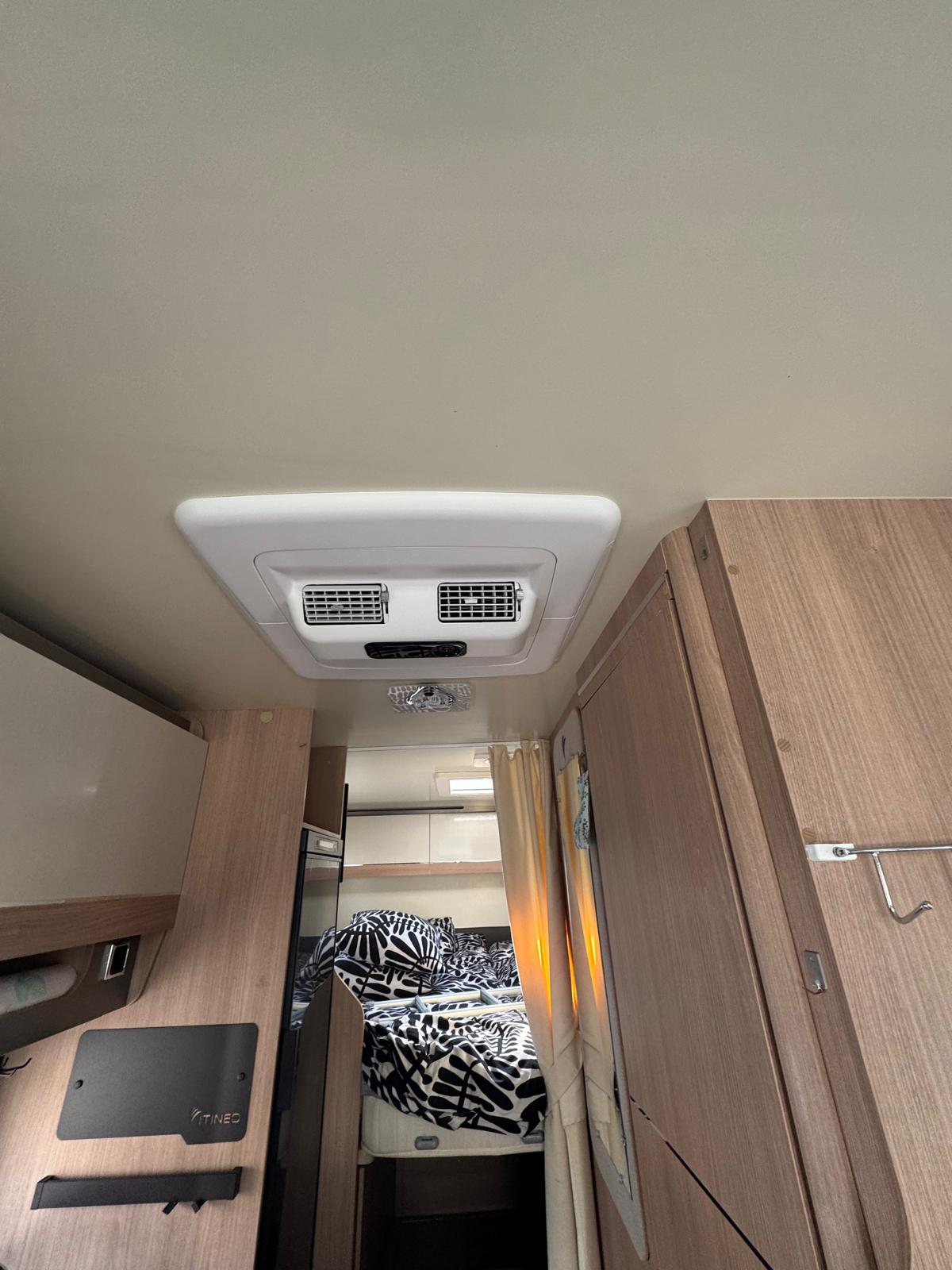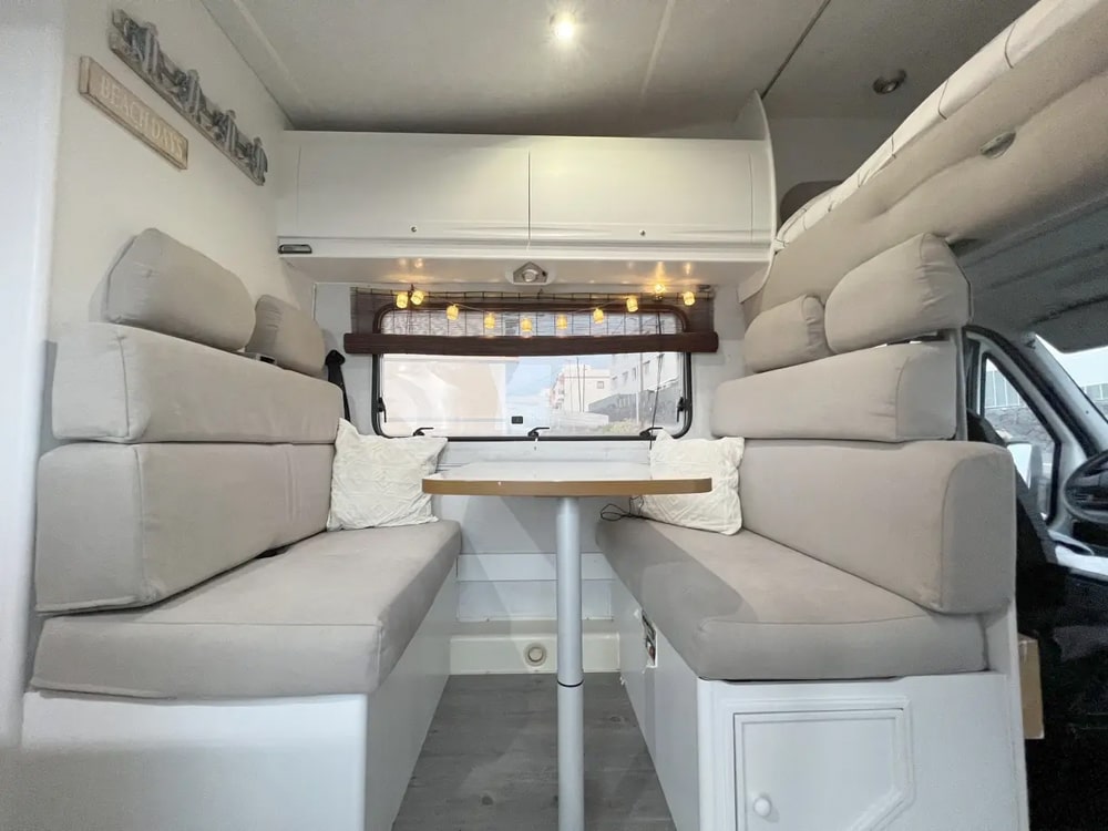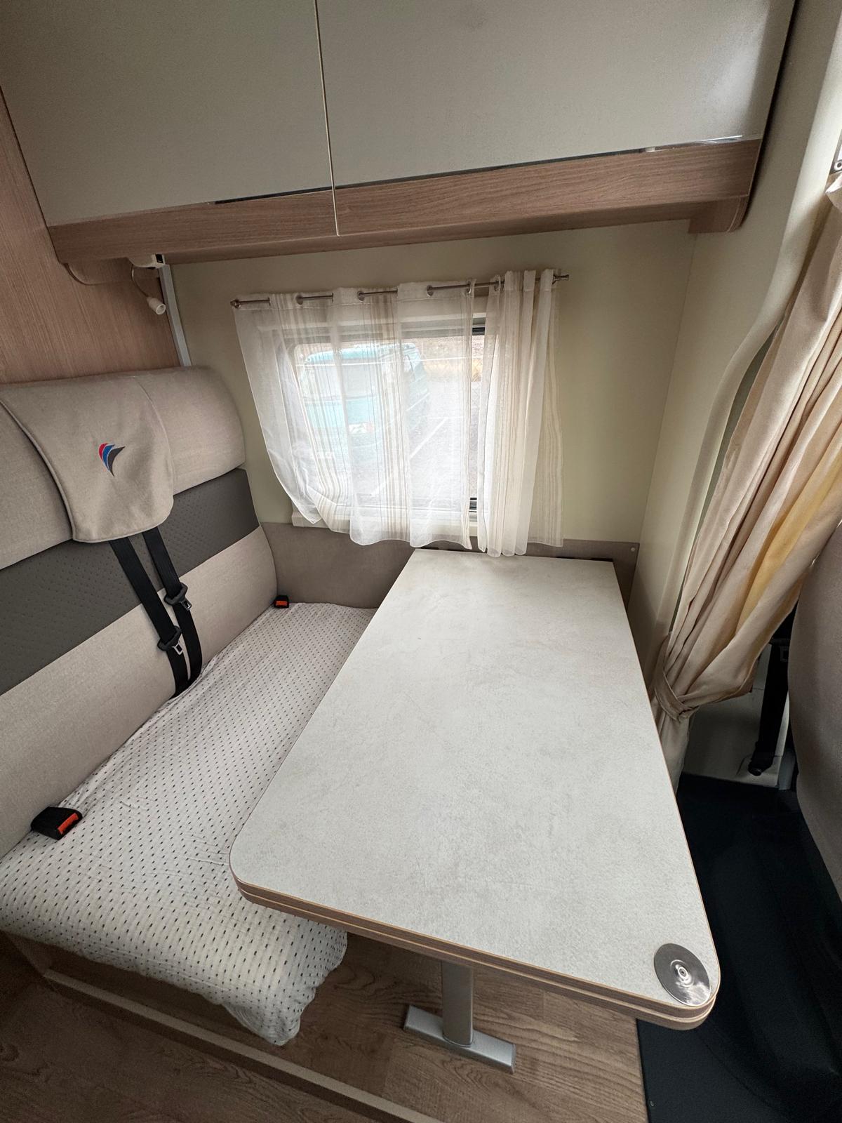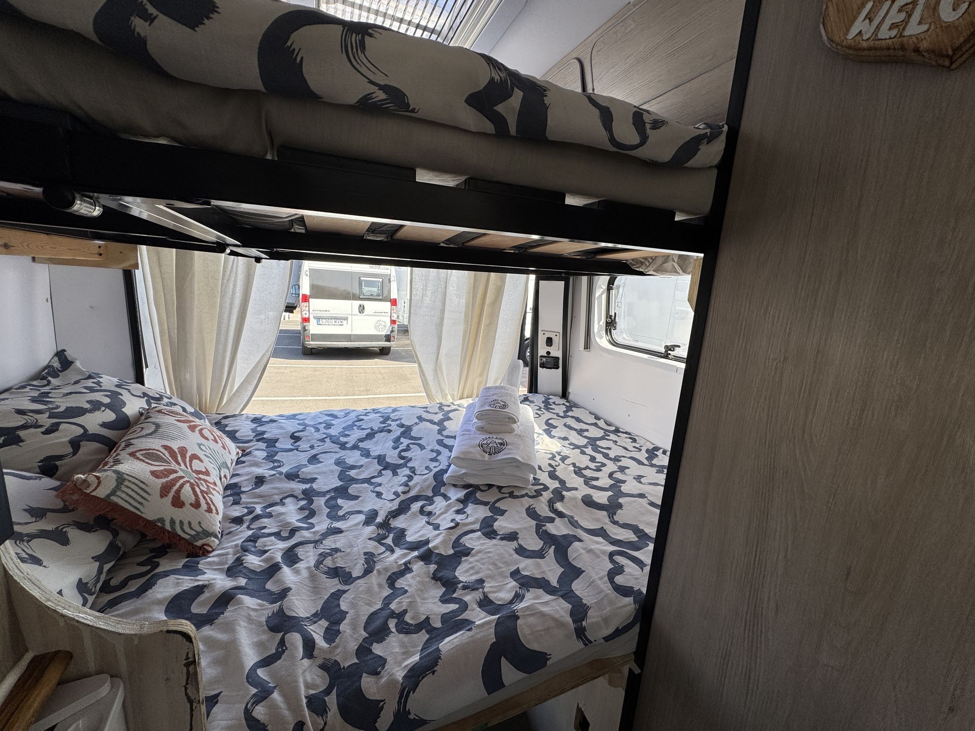 Esta camper es perfecta para familias, amigos o parejas que buscan comodidad y libertad en la carretera. Cuenta con dos camas en litera, una de ellas replegable en el techo, lo que la convierte en una opción muy práctica si solo viajan dos personas, dejando más espacio y comodidad durante el día.