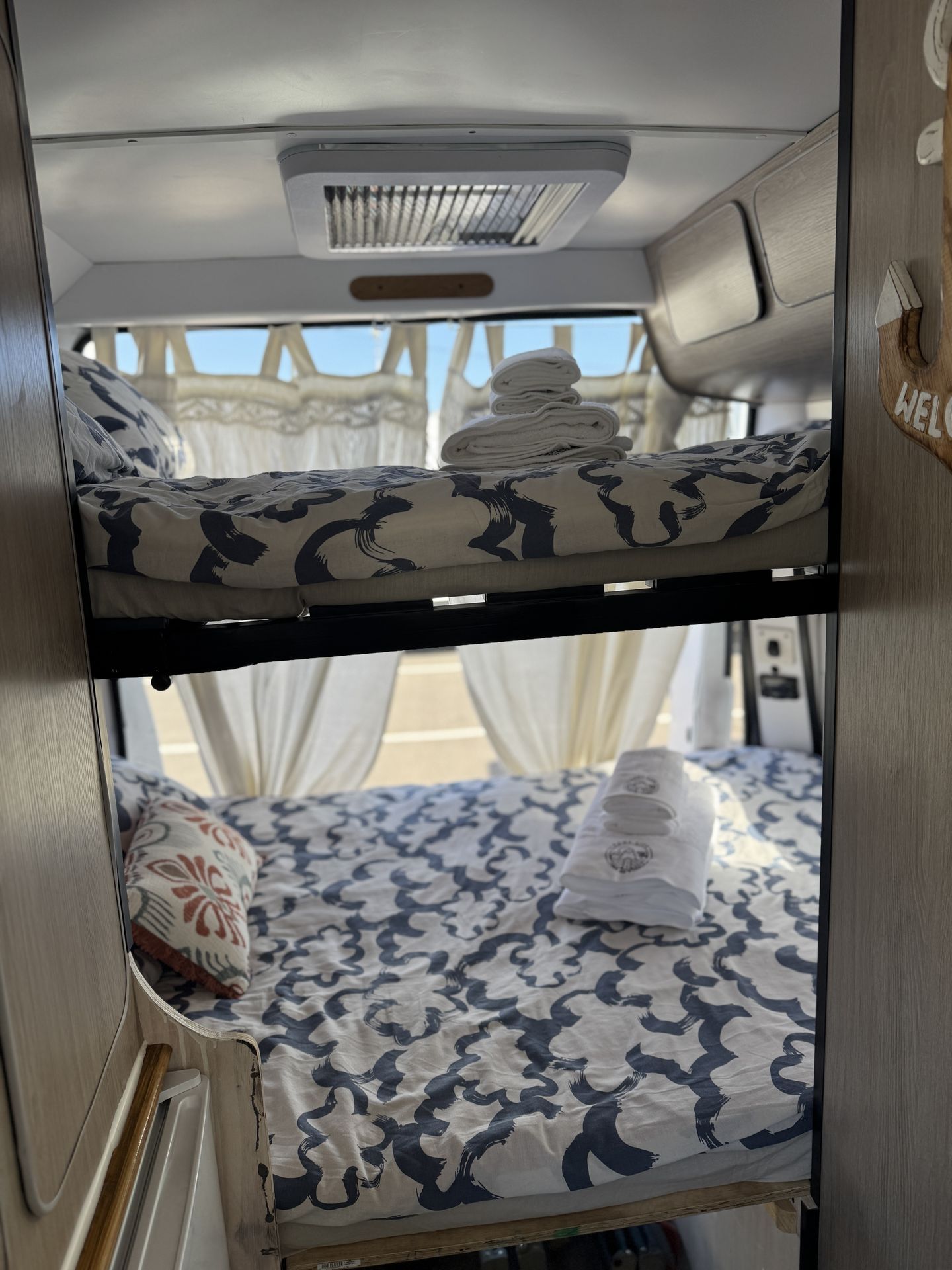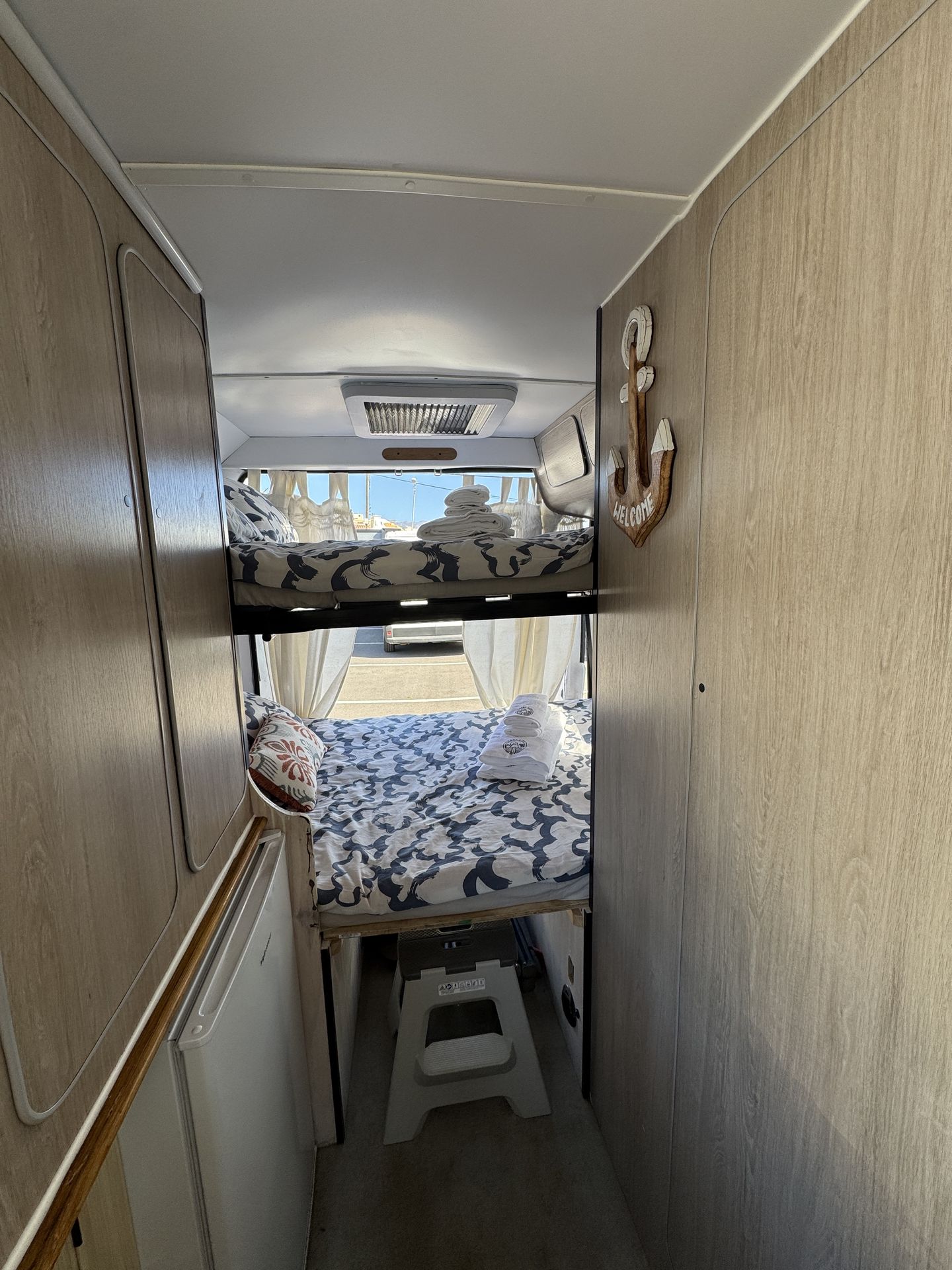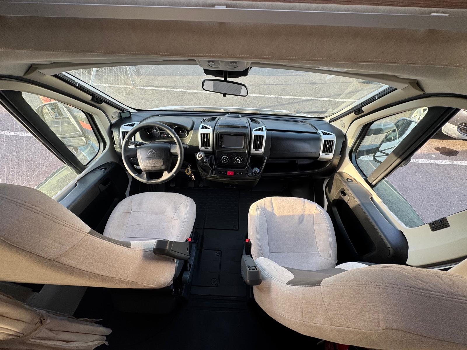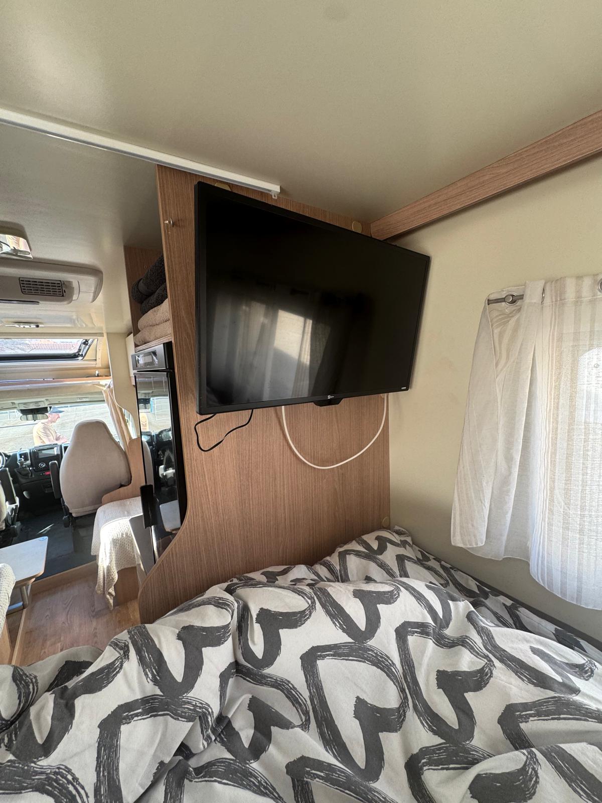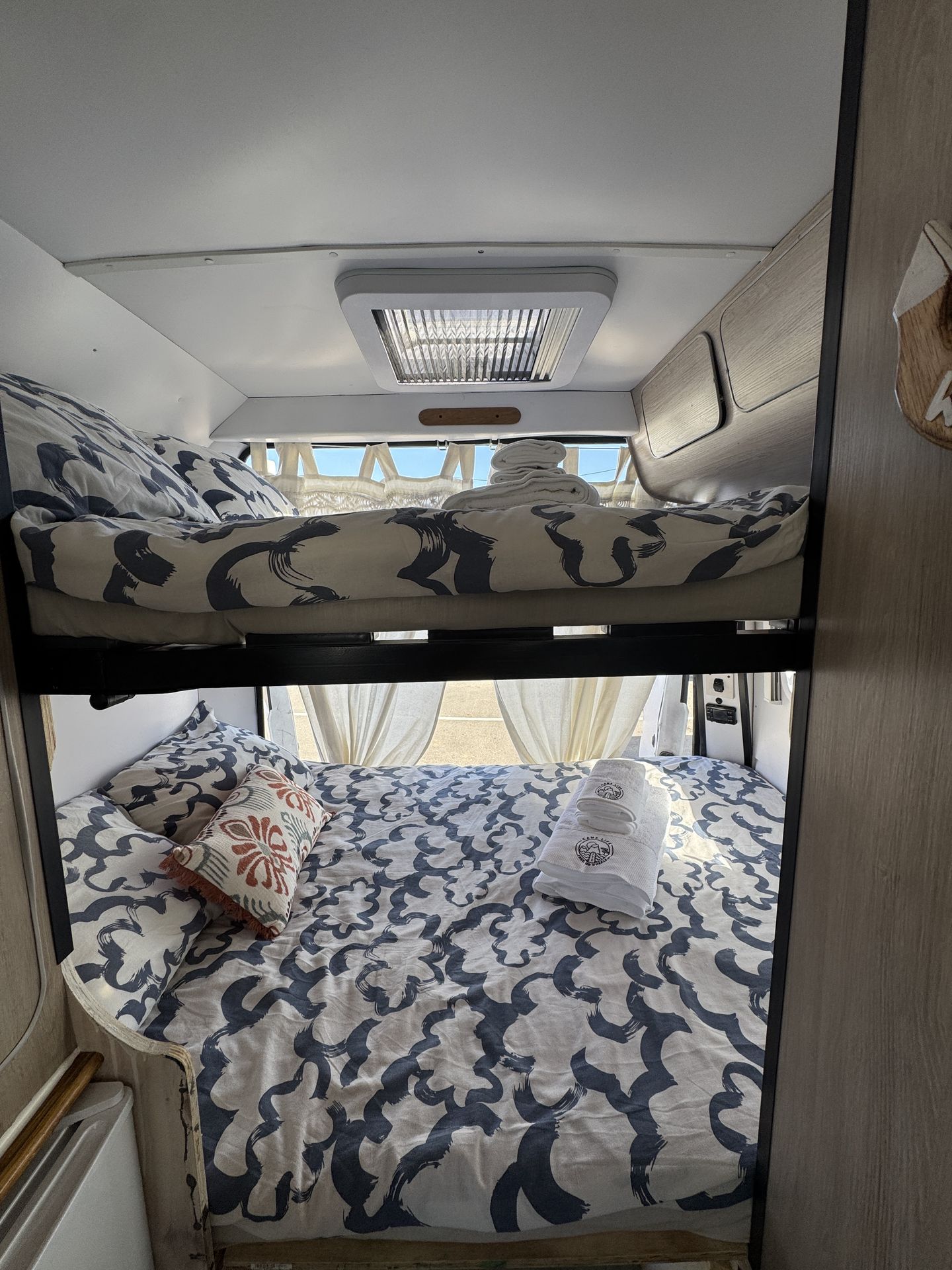 Esta camper es perfecta para familias, amigos o parejas que buscan comodidad y libertad en la carretera. Cuenta con dos camas en litera, una de ellas replegable en el techo, lo que la convierte en una opción muy práctica si solo viajan dos personas, dejando más espacio y comodidad durante el día.
