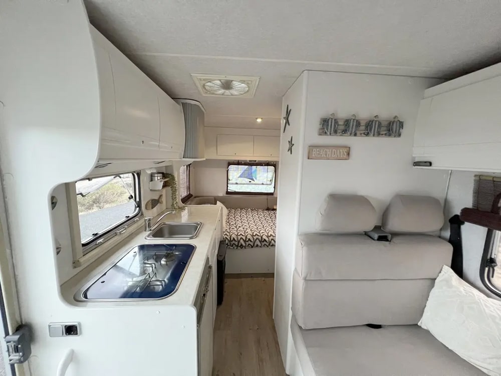 En su interior encontrarás una cama doble amplia y cómoda, perfecta para descansar tras un día explorando, y espacio adicional donde puede dormir un niño pequeño cómodamente. La cocina está completamente equipada con fogones, fregadero, utensilios y nevera, para que puedas preparar tus comidas como en casa. Además, cuenta con ducha, agua caliente y panel solar para que tengas autonomía total.