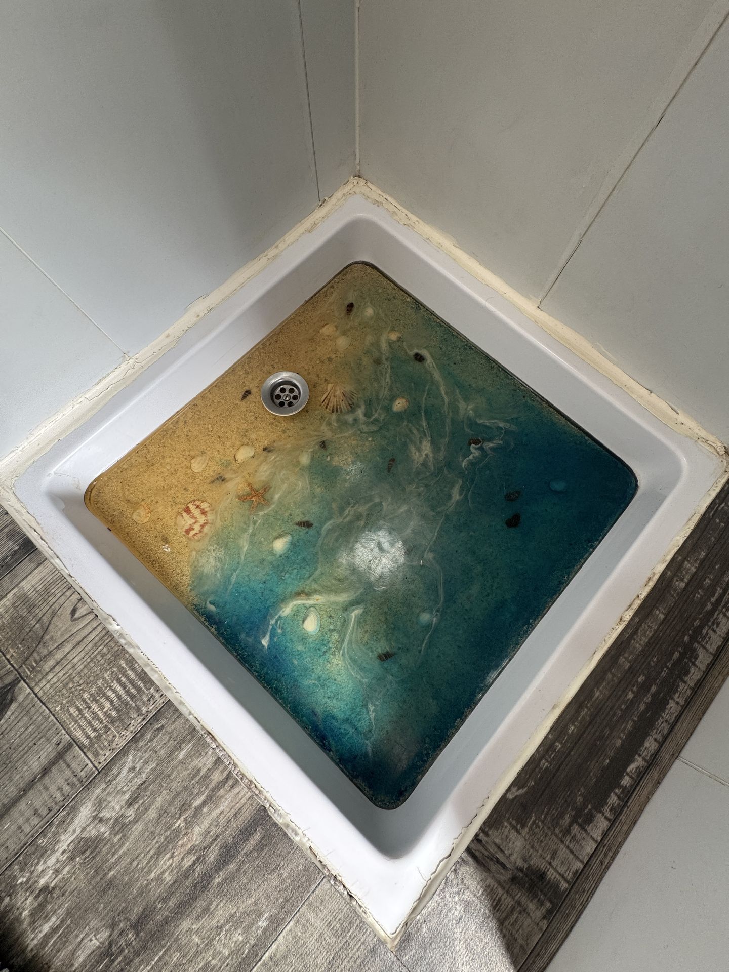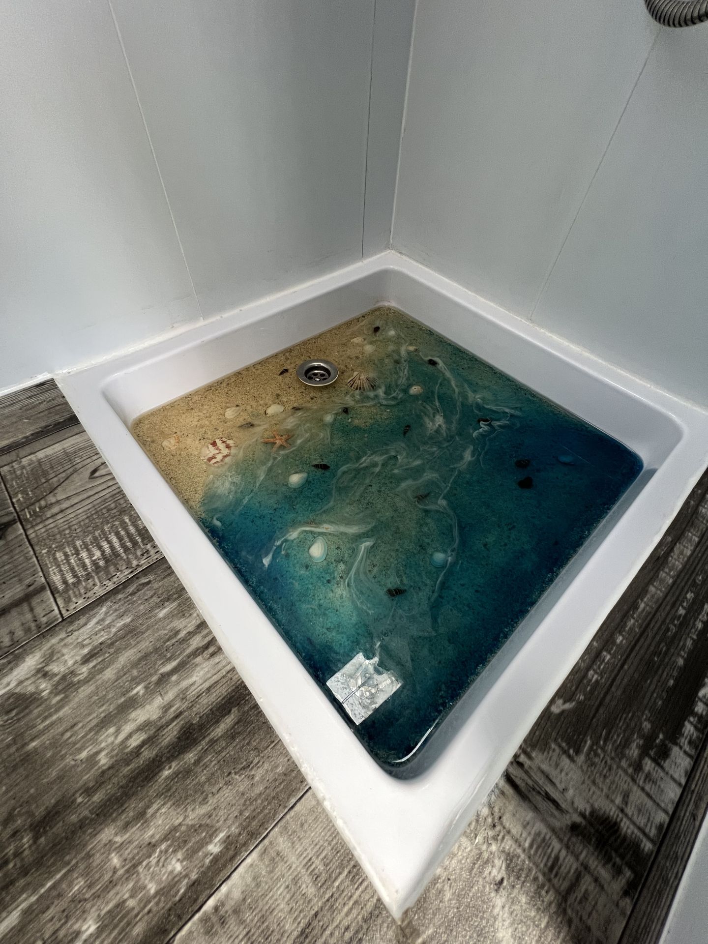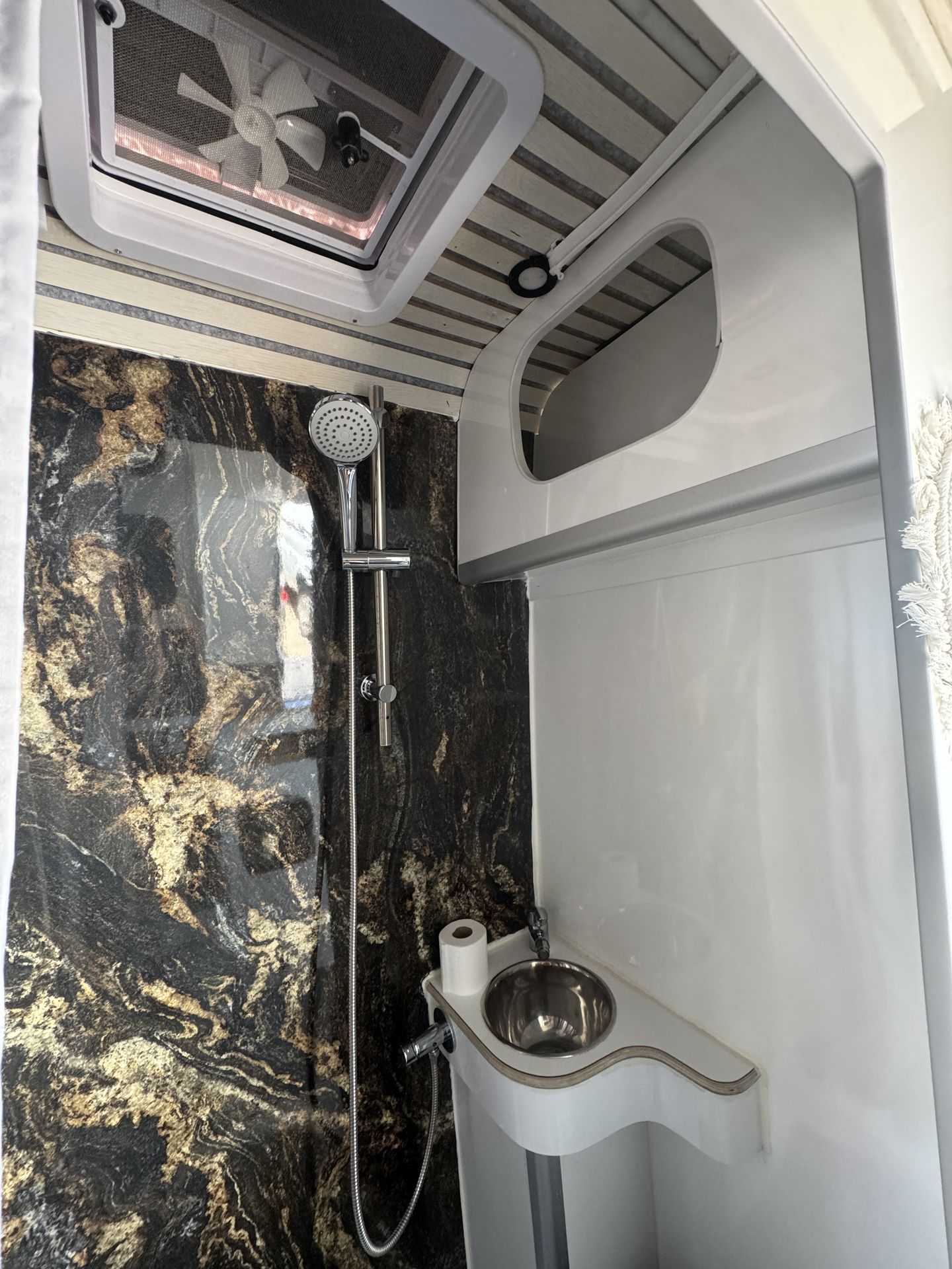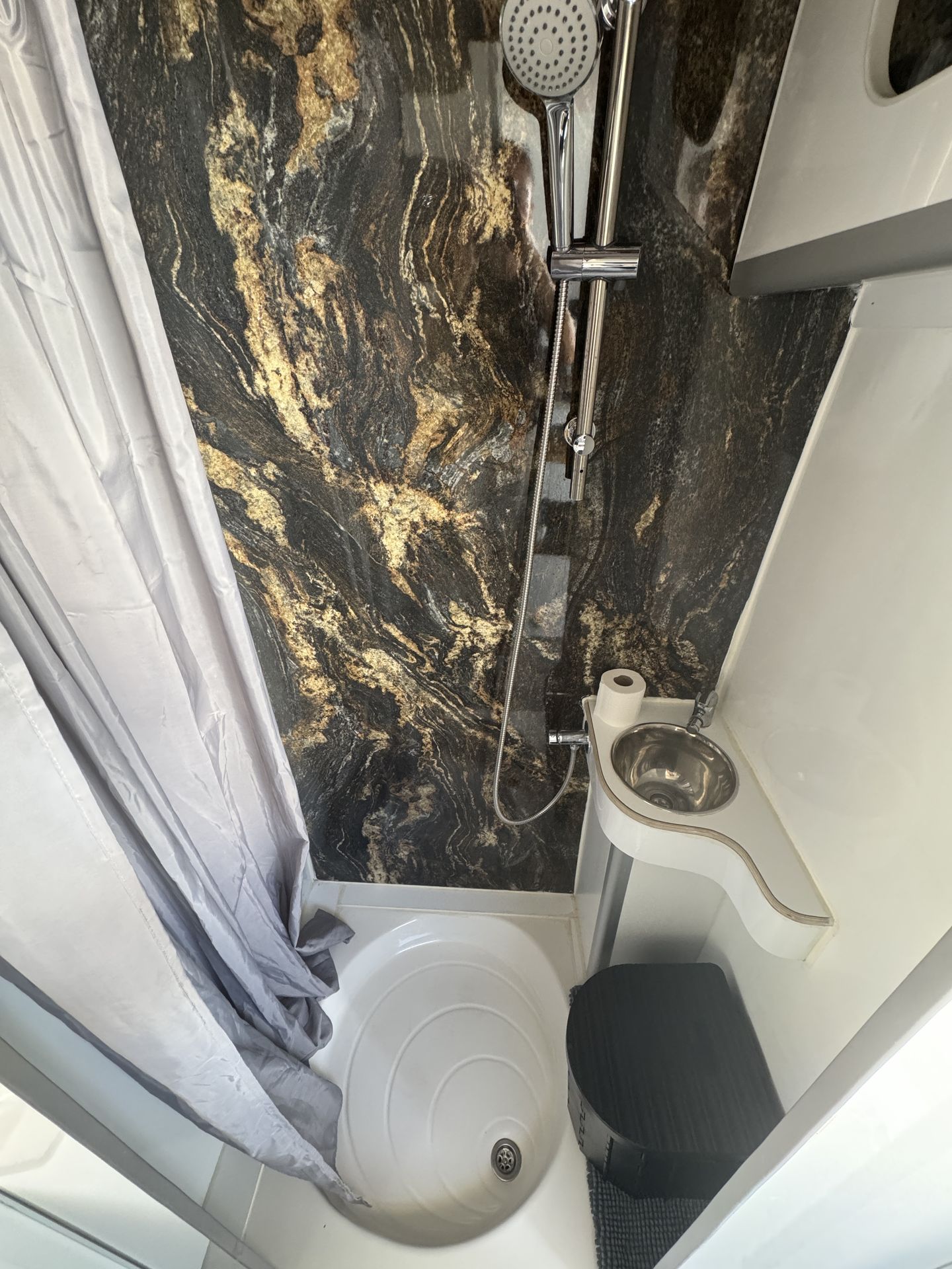 fregadero con ducha exterior y un tanque de agua de 25L