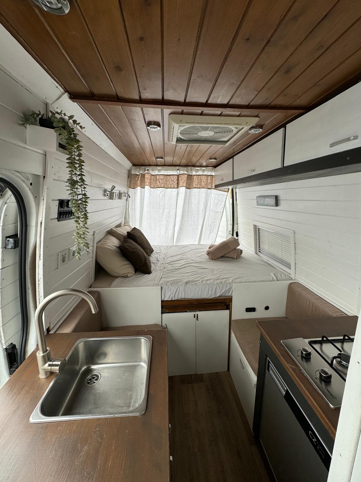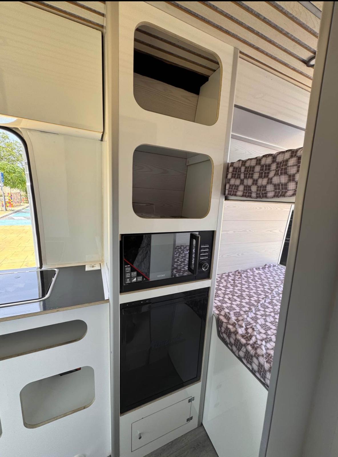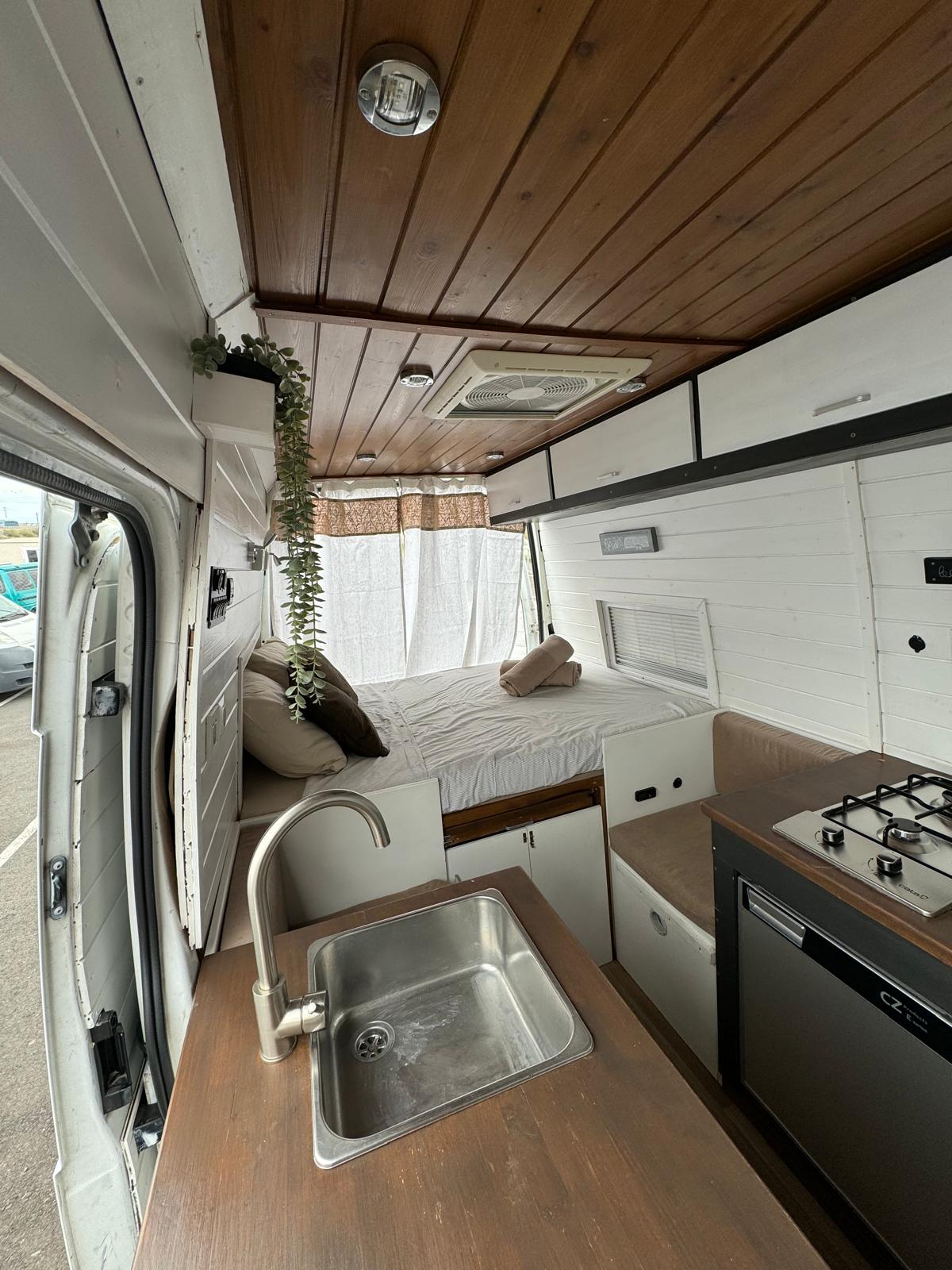 Equipada con una cama cómoda, cocina completa, nevera, ducha, panel solar, y espacio de almacenaje inteligente, esta camper está diseñada para que no te falte de nada. Tanto si planeas una escapada romántica como una ruta más larga, aquí tendrás el equilibrio perfecto entre funcionalidad y confort.