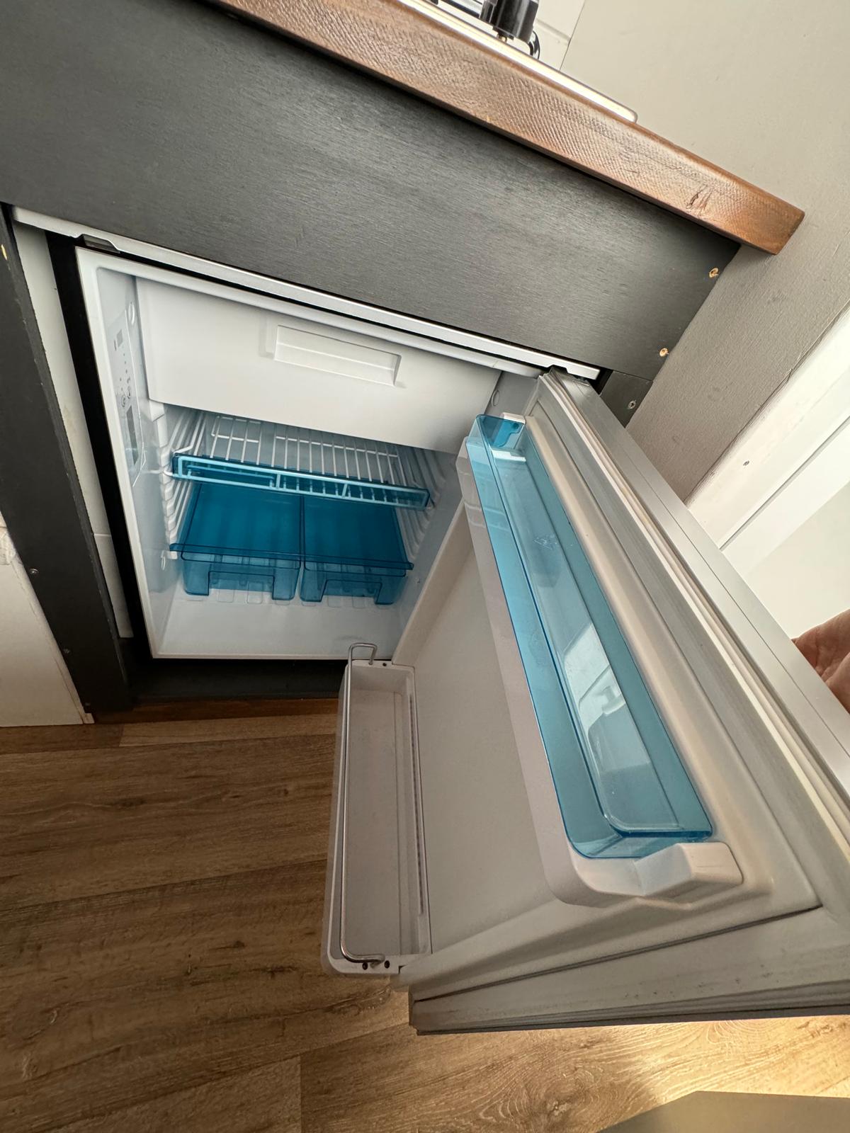 • Nevera de 50 litros con congelador integrado, funciona con batería auxiliar
