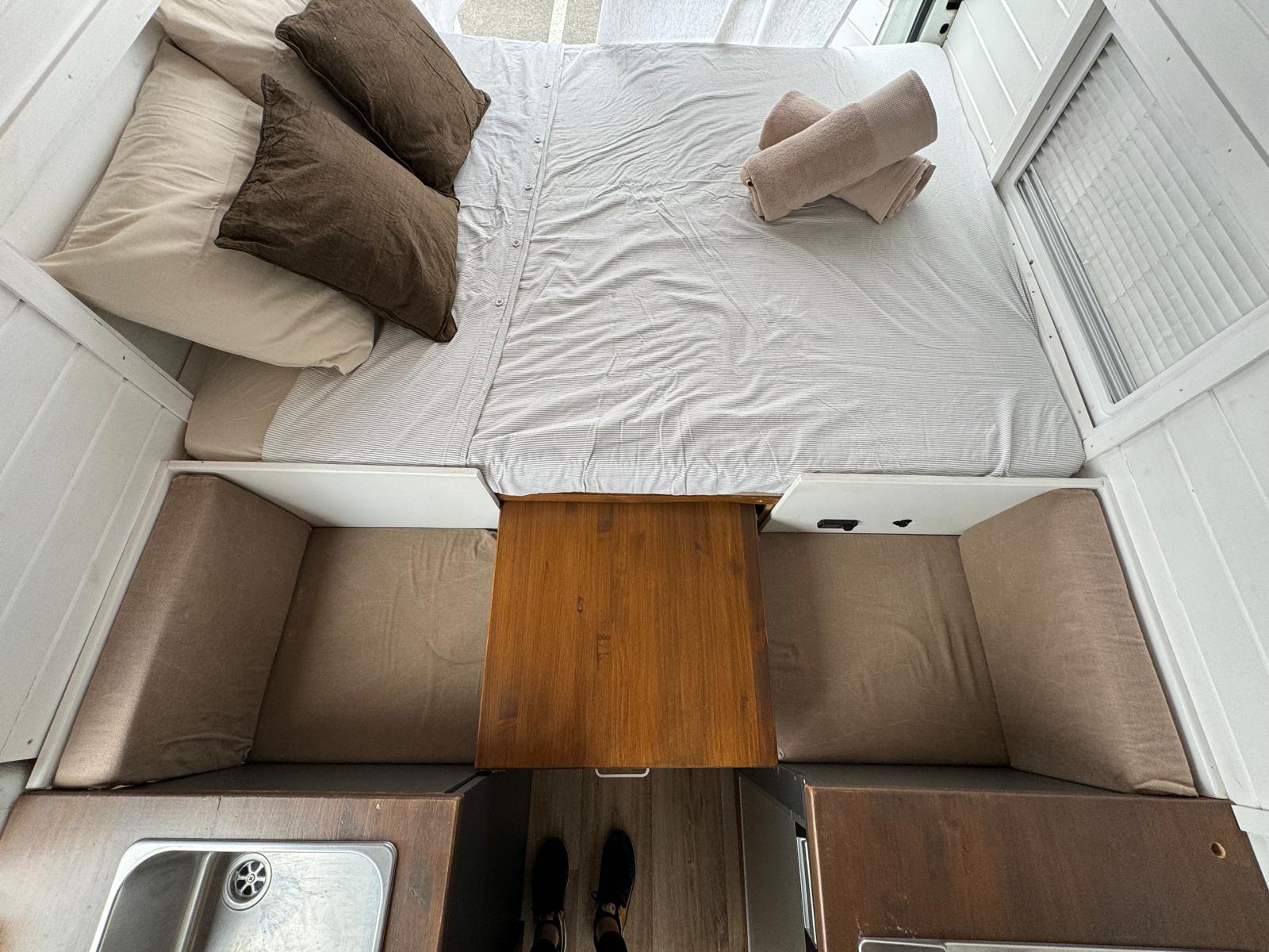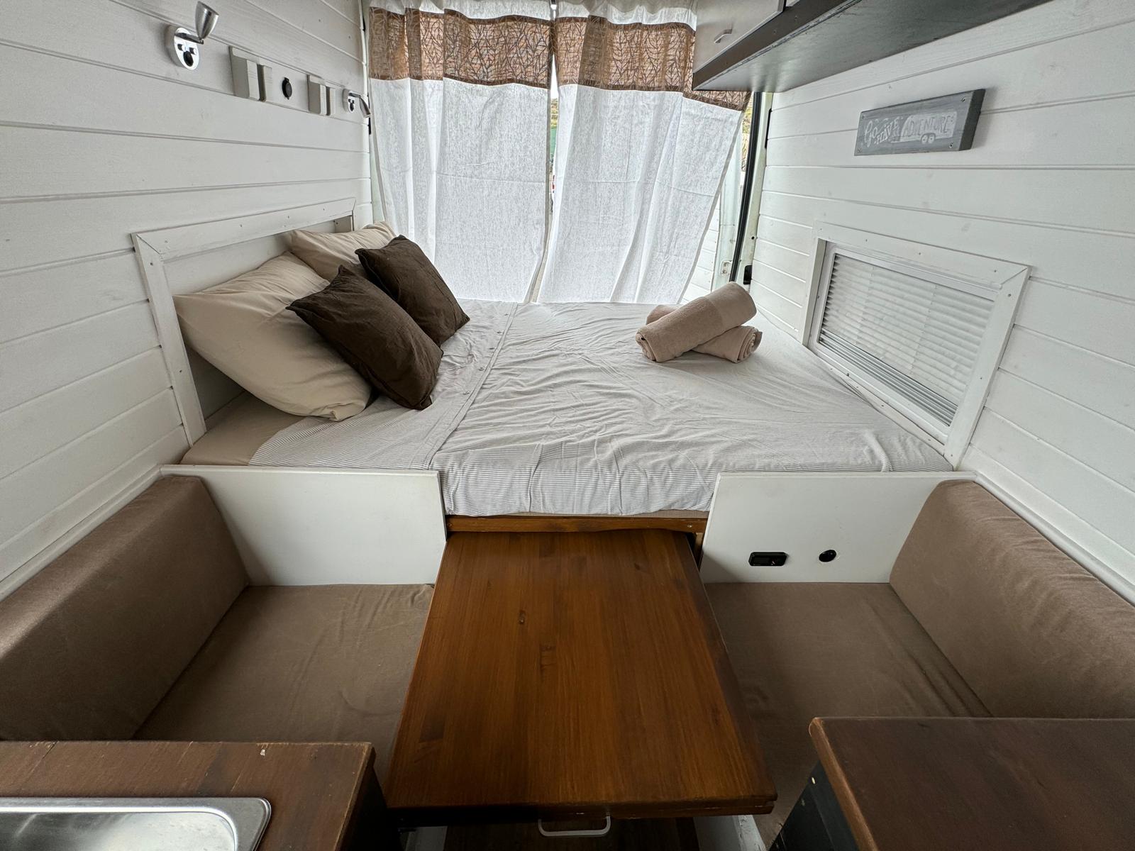 La caravana se entrega lista con las camas hechas, mantas adicionales, toallas de ducha y playa. Viene también con la mesa y sillas para el exterior. Está hecha para explorar la isla con total libertad sin tener que ir a un camping porque tiene una placa solar que va cargando las baterías.