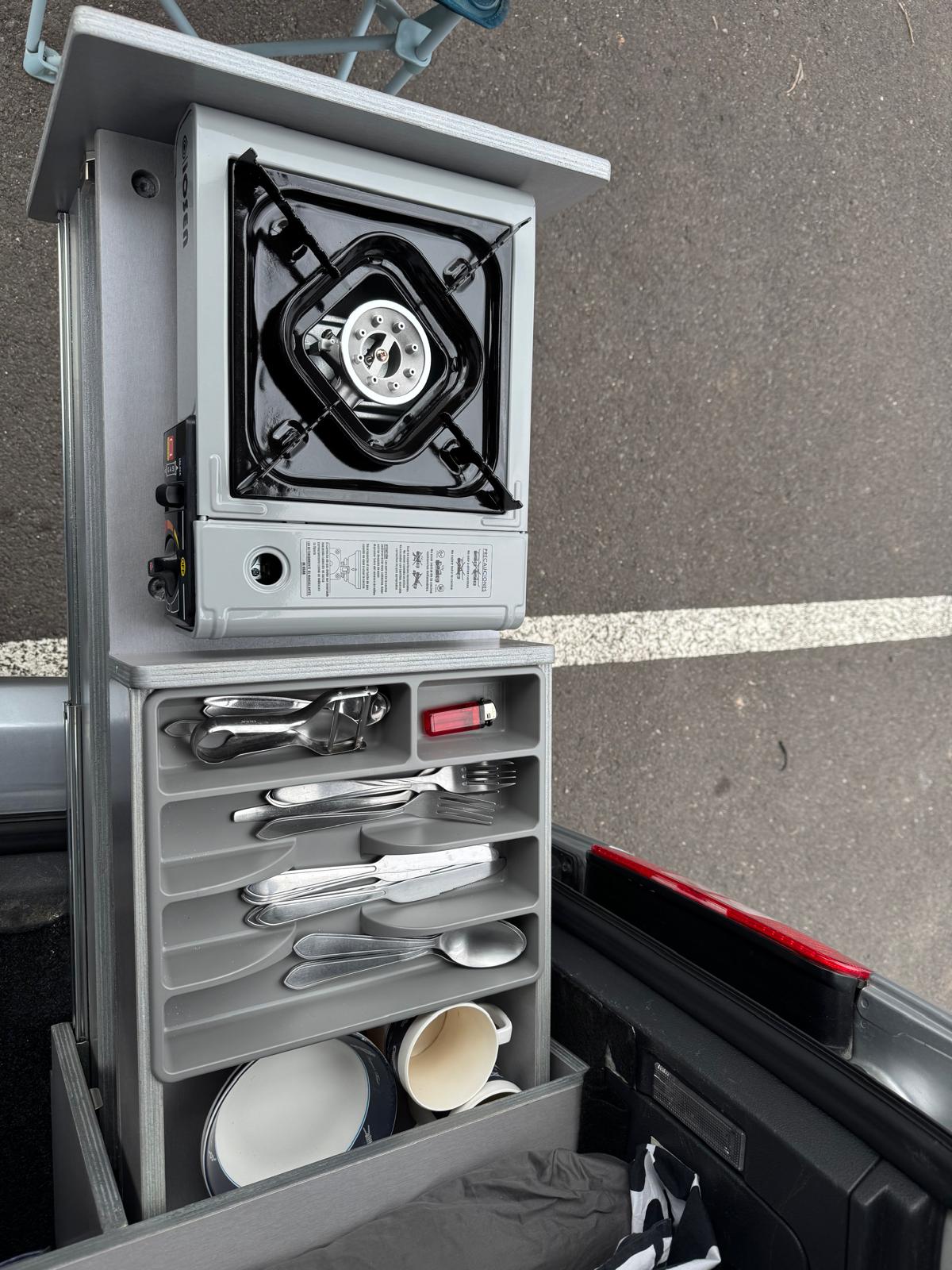 Este Caddy camperizado es ideal para una escapada sencilla y cómoda. Compacto pero muy funcional, ofrece lo básico para disfrutar de unos días de libertad: cama para dos personas, pequeña cocina portátil, espacio de almacenaje, y batería auxiliar para cargar dispositivos.